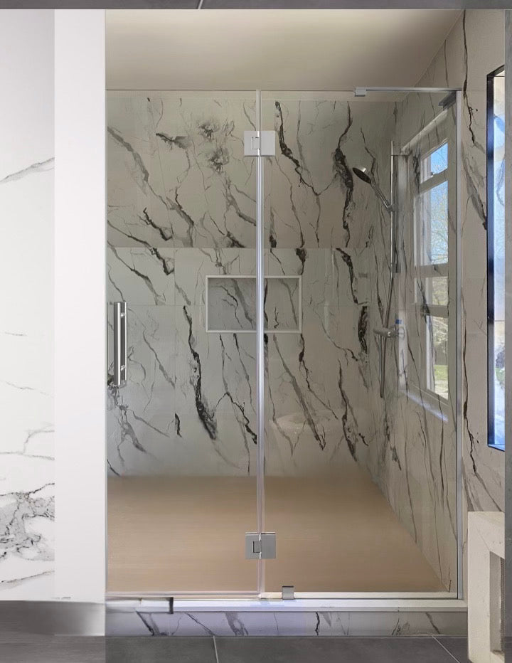 Miko's Hinges Custom shower enclosure is crafted from 304 stainless steel hinges and tempered glass with Klearteck Treatment at 3/8" thickness. It can be customized to fit almost any space, with a 30"-60" Width and 30"-48" Return panel available in stock for delivery within three days. Payment must be made in advance; no returns are accepted. For exact measurements and pricing, please email order@istyleusa.com.