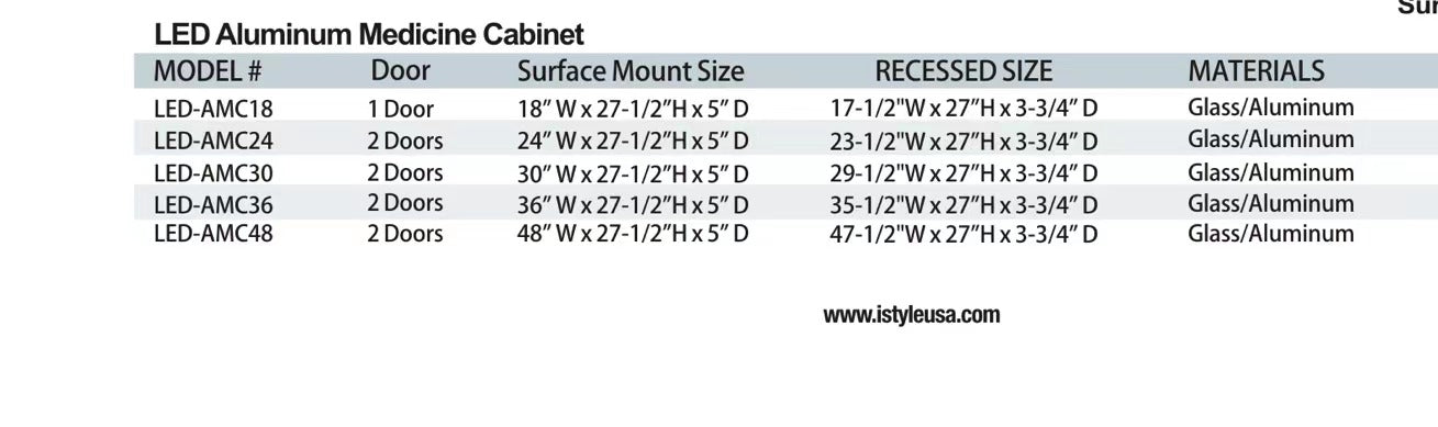 Surface Mount 30"Width x 27-1/2" Height x 5" Depth Recessed Mount 30-1/2"Width x 27" Height x 3-3/4" Depth