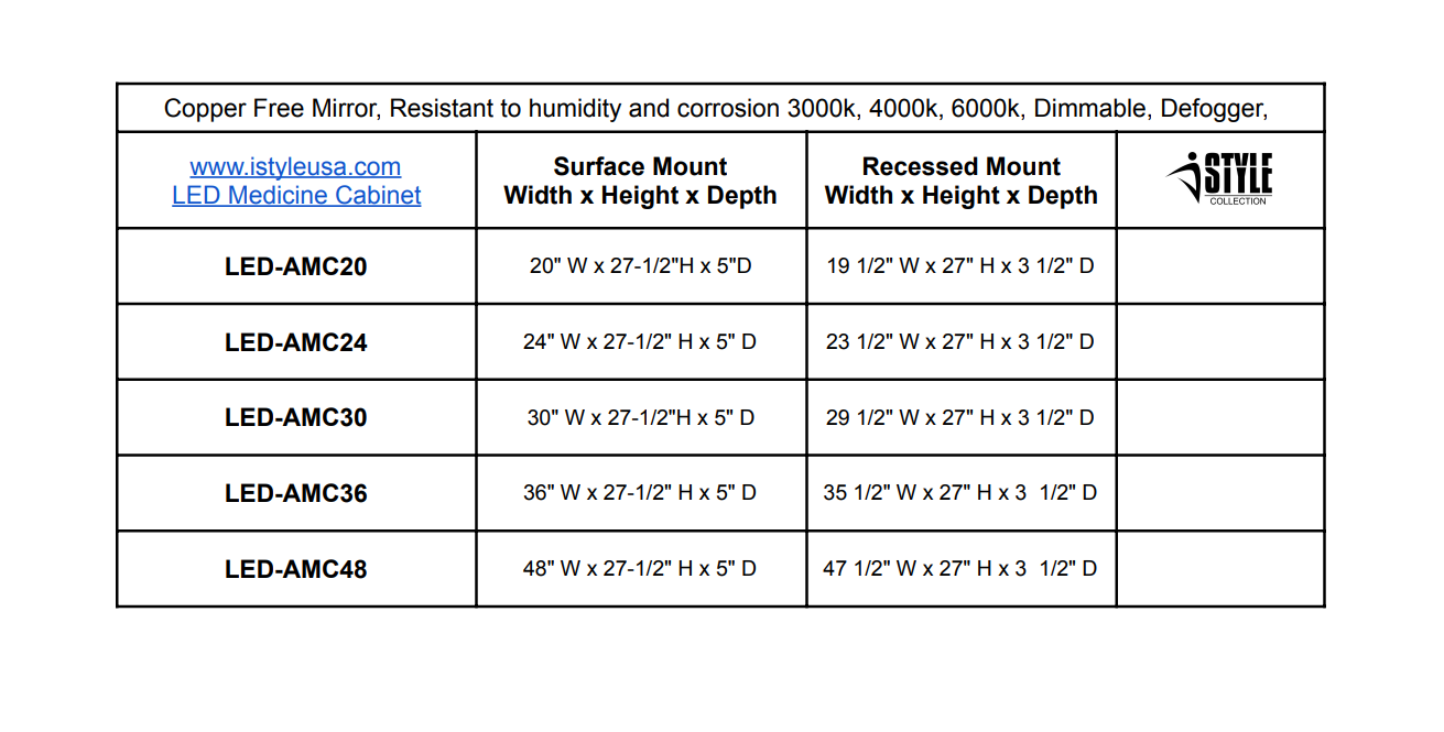 Surface Mount 36"Width x 27-1/2" Height x 5" Depth Recessed Mount 35-1/2"Width x 27" Height x 3-3/4" Depth